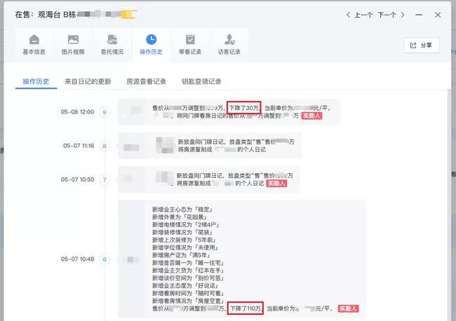 在南山,一个名为“观海台”的楼盘房源,两天内报价下调140万。其中,5月7日下降110万;5月8日,业主又下调了30万。该楼盘位于南山区商业文化中心区,有配套名校。