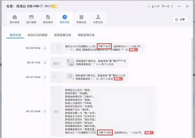 在 南山,一个名为 “ 观海台” 的楼盘房源, 两天内报价下调140万。其中,5月7日下降110万;5月8日,业主又下调了30万。该楼盘位于南山区商业文化中心区,有配套名校。