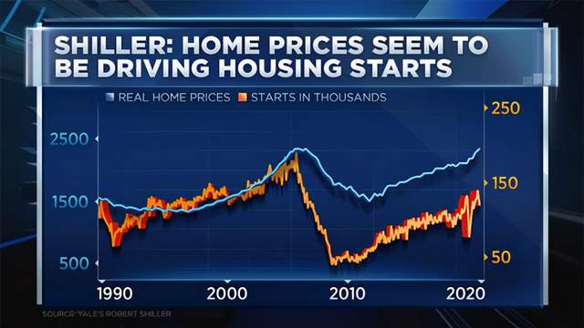 席勒发现,在过去30年里,房价似乎推动了新屋开工。他看到这种模式再次出现,并在一个特殊的图表中强调了它。