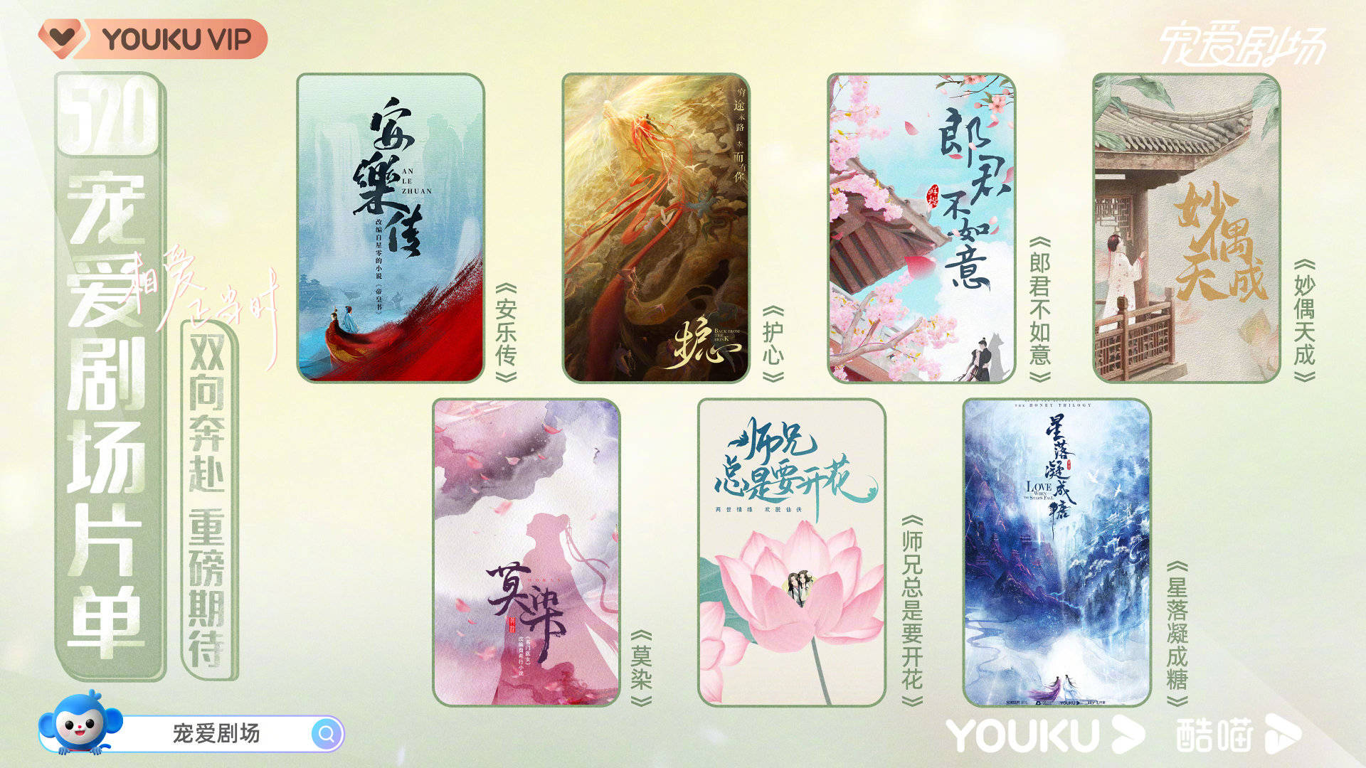 尽管宠粉再升级,但优酷依然没有脱离“宠爱剧场”的甜宠本质。赵露思&刘特主演的《一不小心捡到爱》、刘学义&王梓薇主演的《清落》、郑合惠子&黄圣池主演的《皮囊之下》正在热播中,不同风格和背景下的情感故事同样抓住了观众的磕糖需求。在待播剧方面,全能宠爱官龚俊&张慧雯主演的《你好,火焰蓝》致敬了最美逆行者,消防员和医生的救援组合令人动容;迪丽热巴&任嘉伦主演的《与君初相识》上演的人鱼羁绊充满了未知与纠葛;宋茜&罗云熙《心跳源计划》用公式丈量科学家的爱情;金晨&王子异《不会恋爱的我们》偏偏全员追爱热恋。另外还有动荡年代上演儿女真情的陈星旭&张婧仪《一见倾心》、讲述萌新记者与围棋天才爱情故事的李兰迪&牛骏峰《舍我其谁》等。这些剧集都将再次进行全面的糖分升级与创新,一改大众对传统甜宠剧的偏见,用高水准的服化道和对口的策略宣传,让所有CP都好磕。