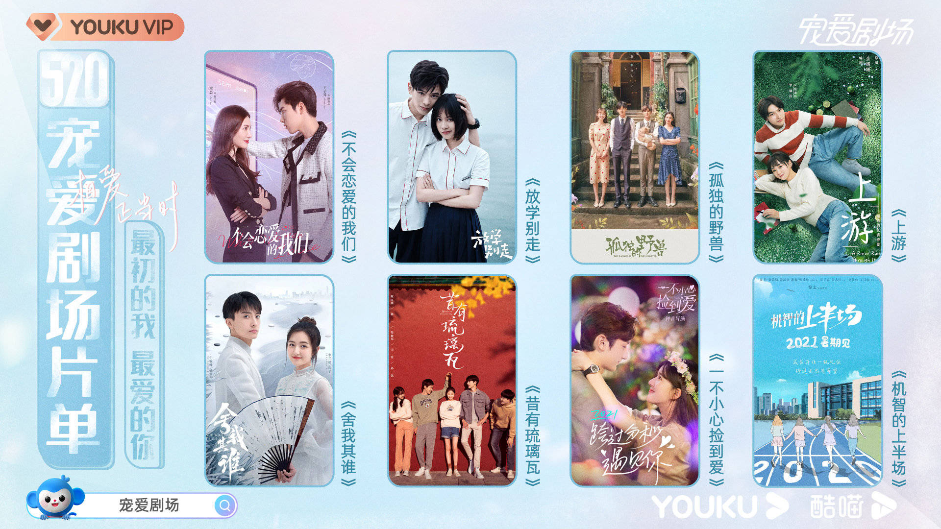 自从优酷去年3月宣布推出“宠爱剧场”,《山河令》、《司藤》等大热甜宠剧热播,精准针对女性圈层发力。今年520,优酷“宠爱剧场”再次玩出新花样,先是公开了二十余部剧集的“宠爱剧场”片单,陈星旭、全能宠爱官龚俊、林一、彭冠英(以姓氏拼音首字母排序)拍摄的夏日男友芭莎大片也正式亮相。