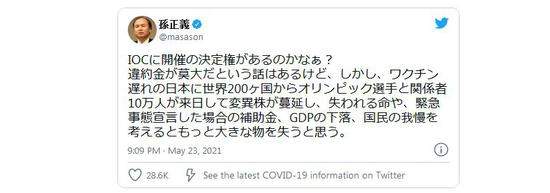 软银集团创始人兼CEO孙正义发布一连串推文,对在新冠肺炎大流行期间是否应该继续举办东京奥运会表达困惑和担忧,因为日本的疫苗接种工作进展缓慢。