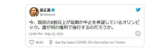 孙正义在一条推文中表示:“现在超过 80% 的国民希望奥运会推迟或取消。是谁,用什么权力在强行推进?”