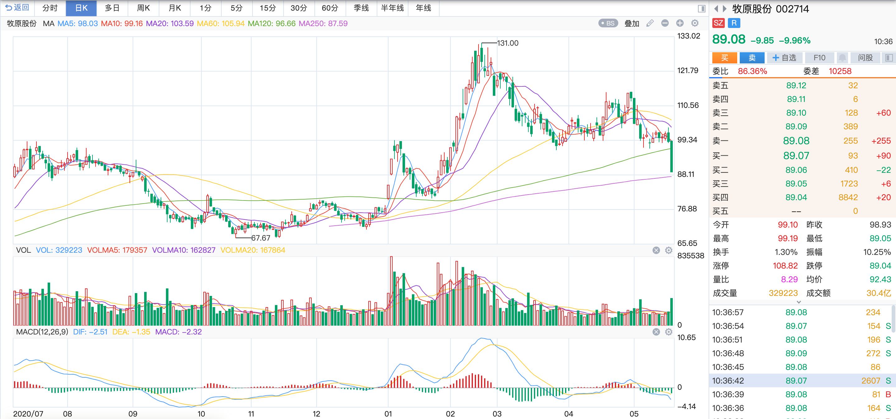 周一早盘,“猪茅”牧原股份(002714,股吧)小幅高开后一路下挫,盘中一度逼近跌停。截至发稿,该股今日成交额已超31亿元,较上一交易日大幅放量。