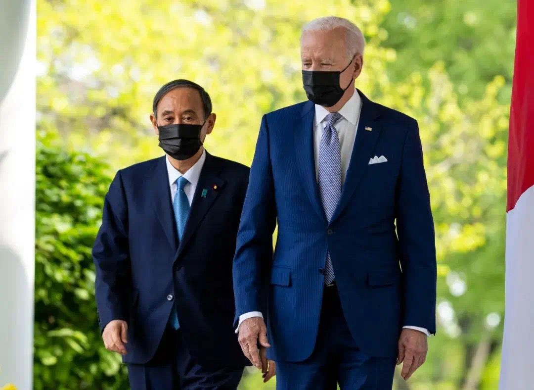 ▲菅义伟(左)和拜登(右)一个多月前会晤。图片来源:新京报网