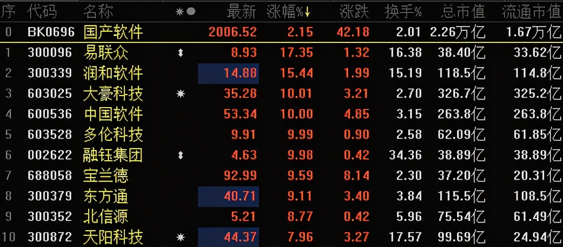 《科创板日报》(上海,研究员 宋子乔)讯,今日(5月24日),国产软件板块强势上涨。截至发稿,大豪科技(35.280, 3.21, 10.01%)、中国软件(53.340, 4.85, 10.00%)、多伦科技(9.910, 0.90,9.99%)强势封板,易联众(8.890, 1.28, 16.82%)、润和软件(14.820, 1.93, 14.97%)、天阳科技(43.100,2.00, 4.87%)、万兴科技(47.450, 3.73, 8.53%)、宝兰德(91.680, 6.83, 8.05%)、东方通(40.720, 3.41,9.14%)、常山北明(8.100, 0.32, 4.11%)等纷纷跟涨,涨幅均超7%。