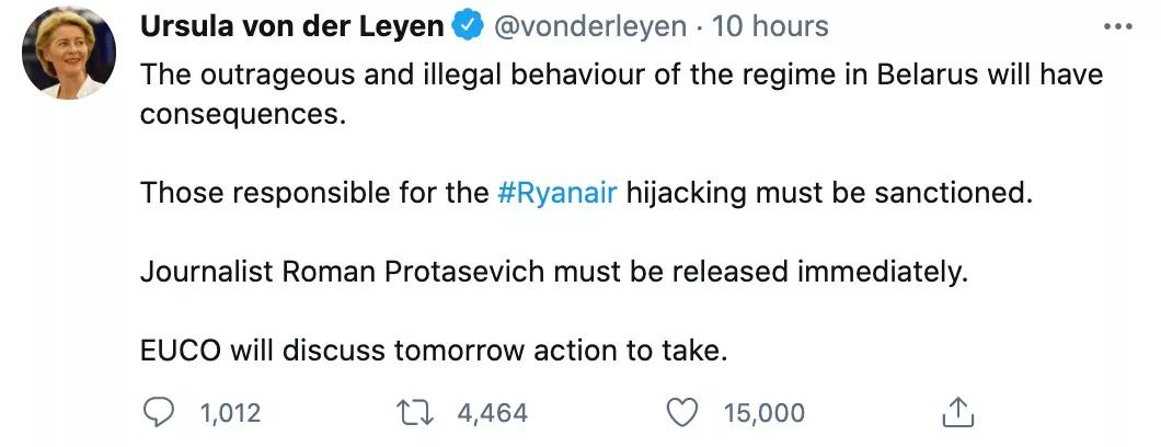 欧盟执行欧洲委员会负责人乌尔苏拉·冯·德·莱恩(Ursula von der Leyen)表示,必须立即释放普罗塔塞维奇(Protasevich),必须对劫持瑞安航空的人进行制裁。并补充说,欧盟领导人周一将在布鲁塞尔开会,讨论采取什么行动。