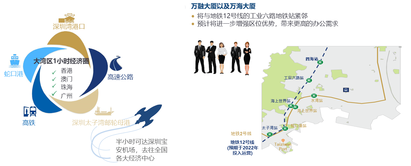 同时,随着大湾区1小时经济圈的建设,蛇口网谷运输网络完善、高效,可实现与全国各大经济中心、大湾区核心城市及深圳产业枢纽及商业中心紧密相连。万融大厦以及万海大厦将与地铁12号线的工业六路地铁站紧邻,预计将进一步增强区位优势,带来更高的空间使用需求。