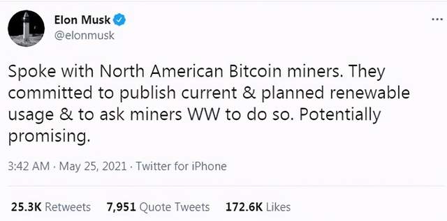 美东时间24日周一美股尾盘时段,马斯克在社交媒体发帖称:“和一些北美的比特币挖矿机构交谈,他们承诺,要发布当前和计划的可再生能源耗用情况,而且呼吁全球的矿工们这么做。这可能有希望。”