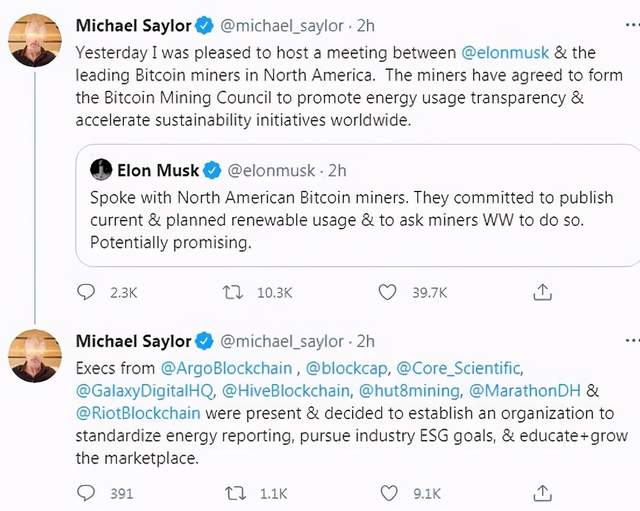 在马斯克发帖后,先于特斯拉持有比特币投资的美国商业智能化软件巨头Microstrategy的CEO Michael Saylor转发了马斯克的这个帖子,并透露,他上周日主持了一场会议,马斯克和北美的龙头比特币挖矿机构均出席。这些机构一致同意,组成比特币挖矿委员会,提高能耗的透明度,加快全球范围的可持续性活动。