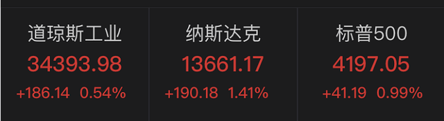 截至收盘,道指涨186.14点,报34393.98点,涨幅为0.54%;纳指涨190.18点,报13661.17点,涨幅为1.41%;标普500涨41.19点,报4197.05点,涨幅为0.99%。