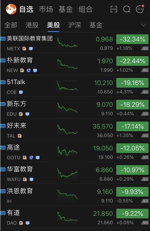 受此消息影响,中概在线教育股开盘即大跌,之后跌幅逐渐扩大,截至收盘,51Talk跌超19%,新东方跌超18%,好未来跌超17%,高途(跟谁学)跌超12%,有道跌超9%,美联国际教育集团更是大跌32%。