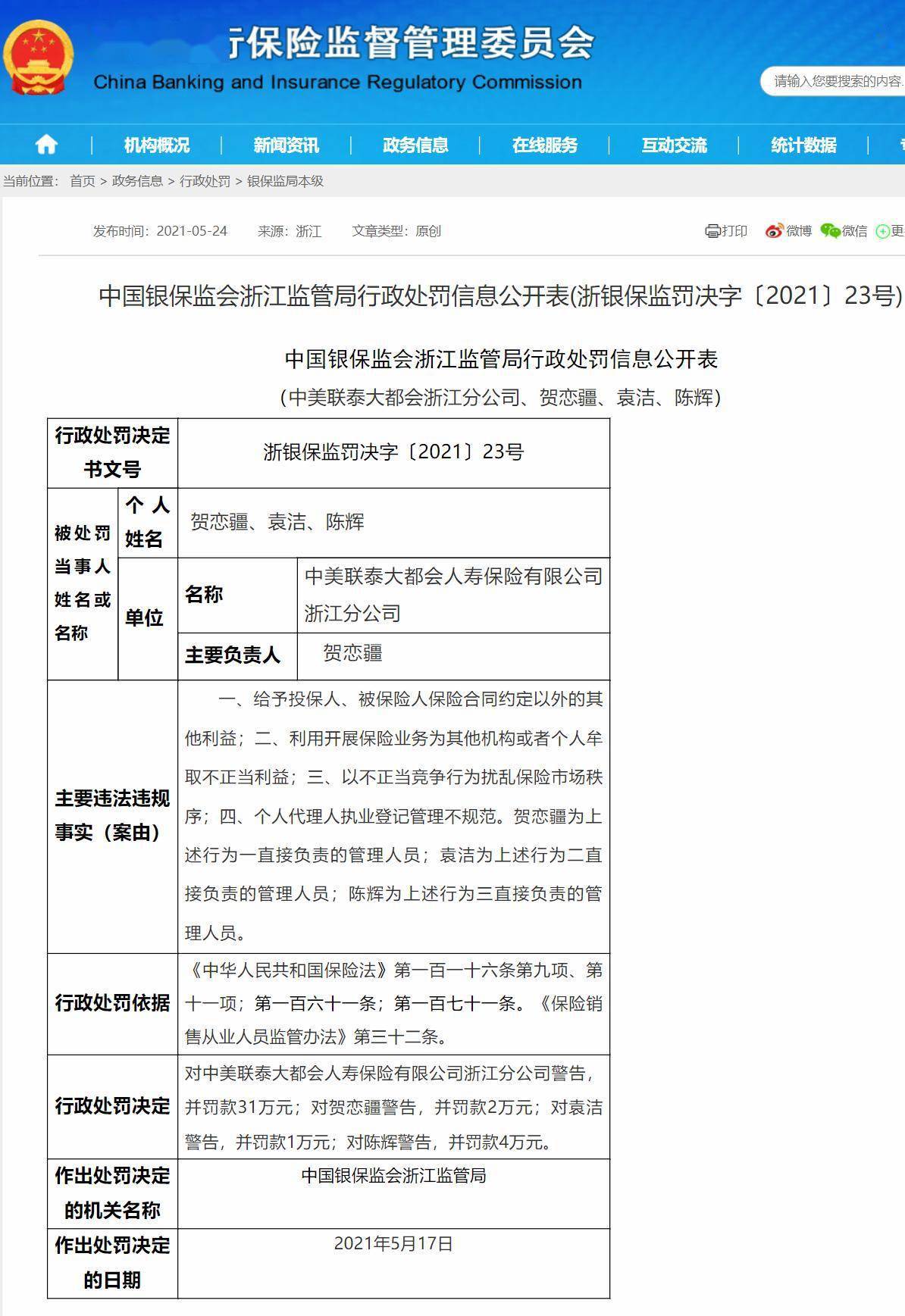 5月24日,中国银保监会浙江监管局发布罚单,中美联泰大都会浙江分公司因存在四项违规行为,被警告并处罚款31万元。