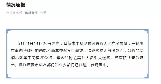 据阜新宣传微信公众号25日消息,5月24日14时20分左右,阜新市中华路东段靠近人民广场东侧,一辆由东向西行驶中的两轮机动车突然发生爆炸,造成驾驶人当场死亡,邻近的两辆小轿车不同程度受损,车内和附近其他人员5人送医,经医院检查为轻伤。爆炸原因市应急部门和公安部门还在进一步调查中。