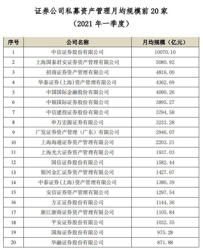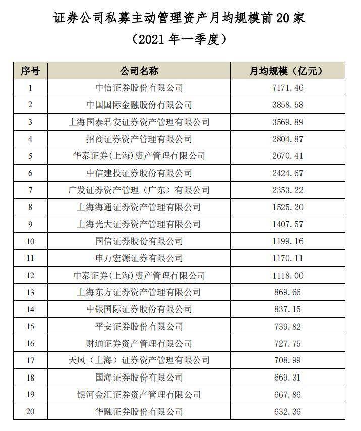 一季度证券公司私募主动管理资产月均规模排名中,中信证券以超7000亿元排名首位,排名2至10位的分别是中金公司、国君资管、招商资管、华泰资管、中信建投、广发资管、海通资管、光大资管、国信证券。