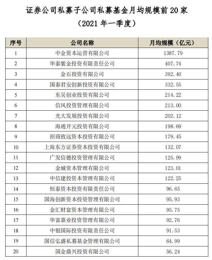 一季度证券公司私募子公司私募基金月均规模排名中,中金资本居首位,华泰紫金投资、金石投资次之。