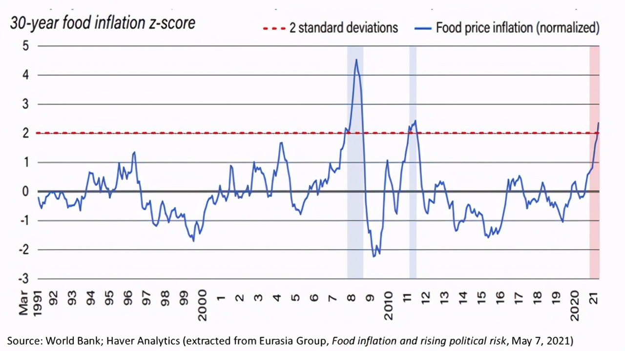 图3显示了过去30年世界银行对中低收入国家食品价格的标准化食品通胀率。根据这一指数,2021年3月,发展中国家的食品通胀率同比高于37%,比30年平均水平高出2.3个点。在过去30年中,该指数仅在2007-2008年和2011年的食品价格危机期间两次达到或超过这一水平。