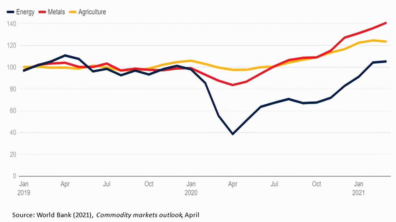 目前大宗商品价格已经收回2020年的失地,在大多数情况下,其走势已经超过疫情爆发之前的水平。中国自2020年以来的经济增长速度、以及伴随着先进企业疫苗推广而来的经济复苏,极大的推动了商品需求,此外对石油、铜和一些食品等某些项目的供应限制,也支撑其价格向上调整。