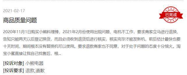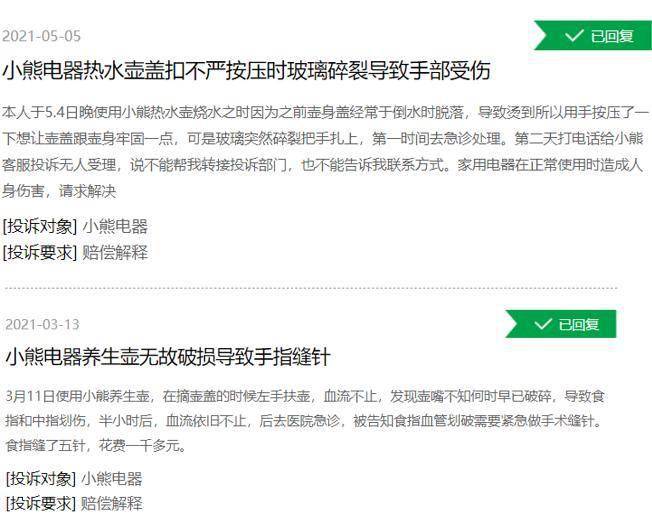 而美的,格力,小熊等其他知名家电品牌的产品质量也遭到大量消费者投诉,不少产品甚至是购买后不久便出现严重的质量问题,甚至导致消费者受伤。