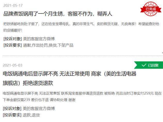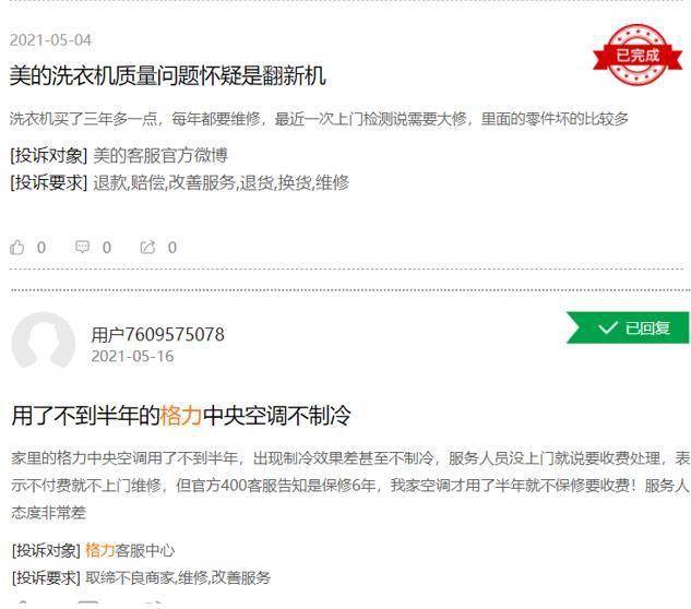 美的,格力,苏泊尔,老板,小熊这些都是知名家电品牌,也都是大型企业,按理说其售后网点和服务速度都应该是顶尖水平,但从消费者投诉的情况看,其售后服务水平明显和品牌不相符,虽然不少投诉目前已经处理完毕,但仍然有大量的消费者还在忍受和等待。