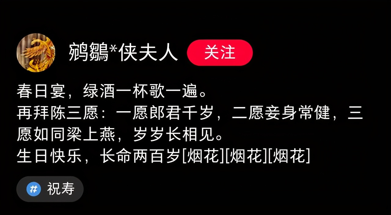 娇妻杜星霖也在社交平台上发布了此则视频,同样用诗词配文为丈夫庆生。这次她引用了冯延巳的古诗词送上祝愿:“一愿郎君千岁,二愿妾身常健,三愿好似梁上燕,岁岁长相遇。”