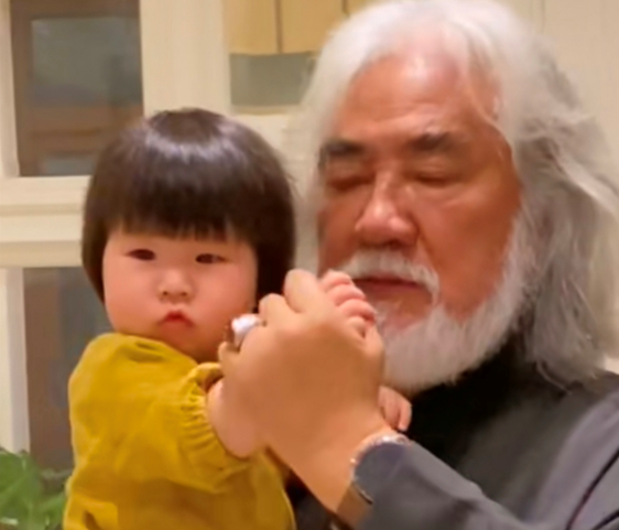 视频中的张纪中仍旧白须白发,身着一身黑色古装,乍看颇有几分隐士高人的感觉,一手抱着一个孩子,丝毫不见艰难。