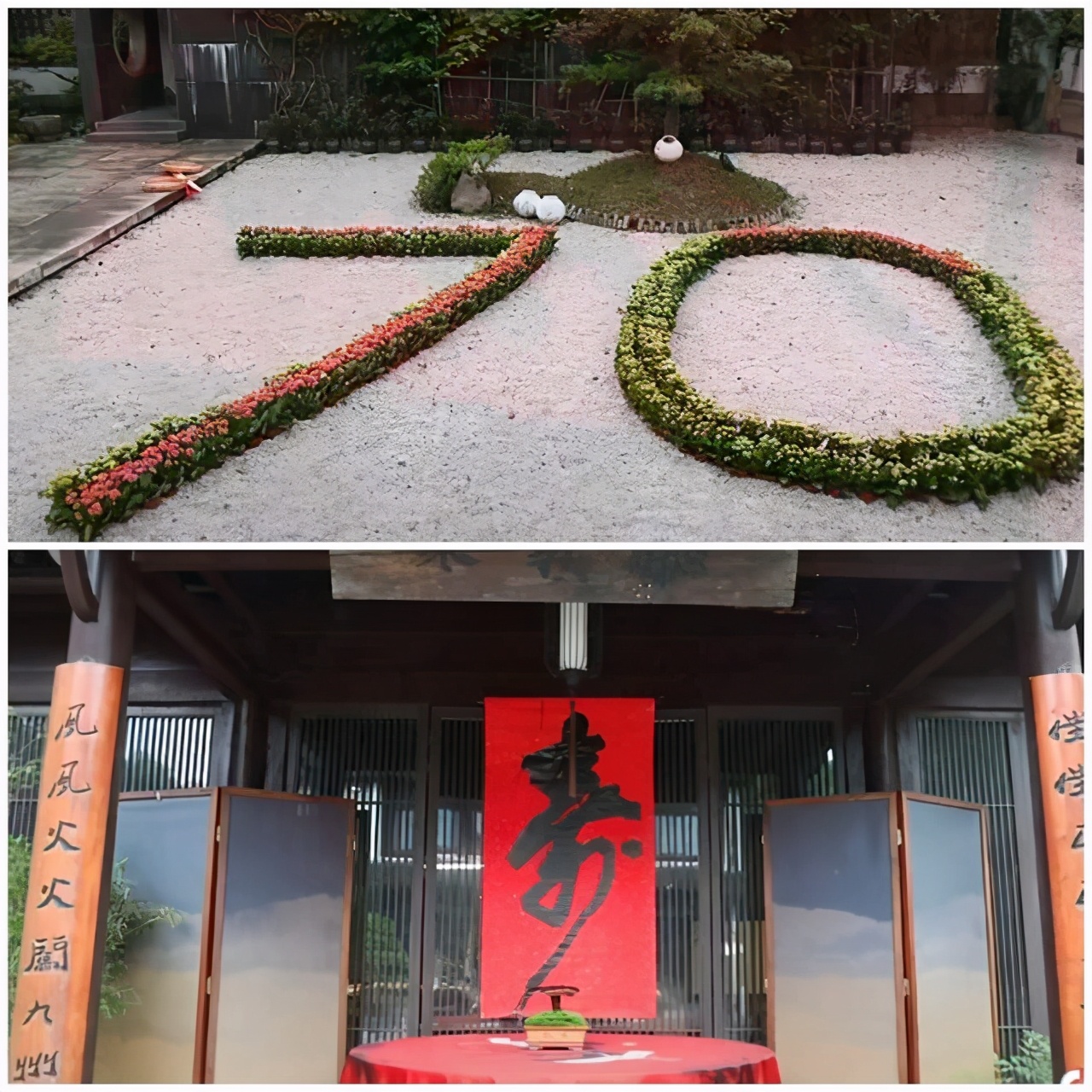 从视频来看,这次的生日宴是在一处古色古香的大宅院中举行。庭院正中间用盆栽植物拼出了一个极大的“70”,代表着张导的年纪。正中挂着一副寿字图,也是十分喜庆。
