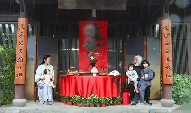 而妻子杜星霖身穿一套飘逸的绿色汉服,一头长发披散在身后,也是仙气飘飘,与之十分相配,怀中则坐着仅有一岁多的闺女小花仙。