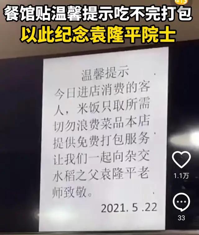 也有餐馆贴出了不要浪费,吃不完打包的温馨提示,一切的一切都是想告诉袁隆平袁老,我们会珍惜他带给我们的一切。