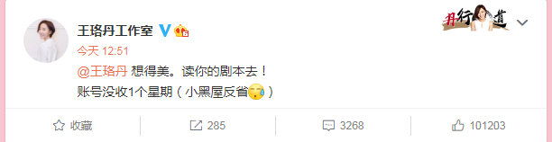 刚刚,王珞丹工作室在官方微博回应称“@王珞丹 想得美。读你的剧本去!账号没收1个星期(小黑屋反省) ”,澄清了退圈信息。