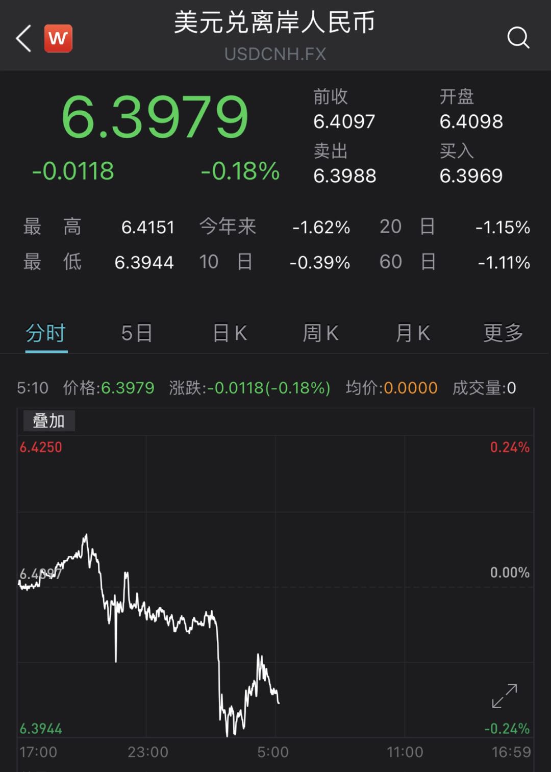 更多反映国际投资者预期的离岸人民币对美元汇率5月25日盘中一度突破6.40关口,盘中最高升值至6.3944,创2018年6月中旬以来的高位。