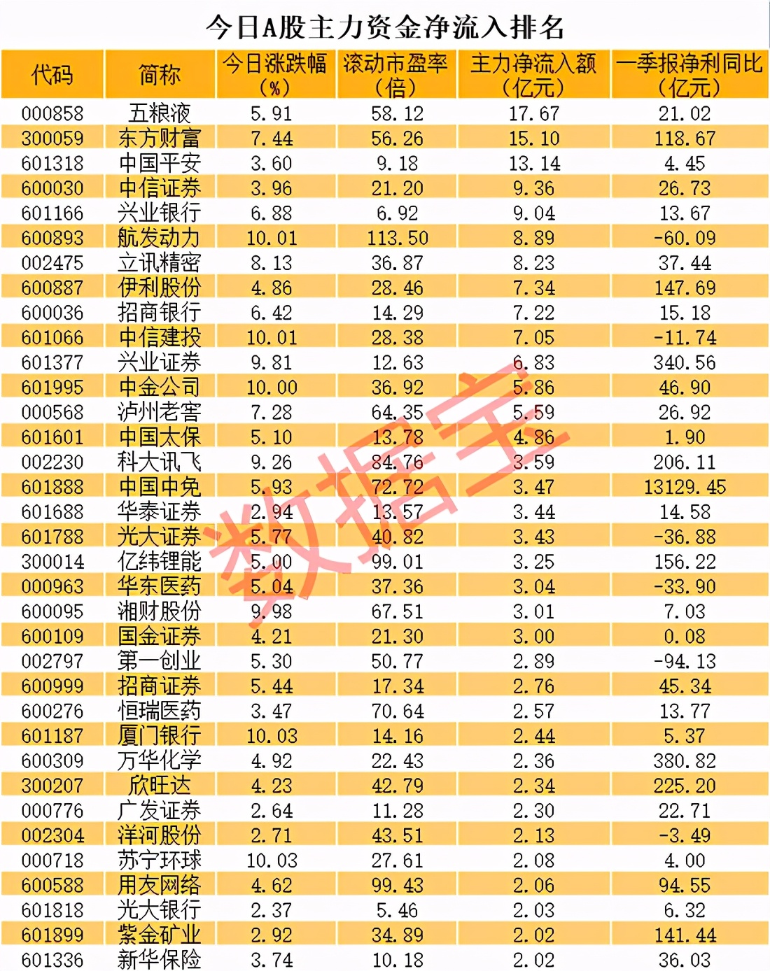 北向资金一般都是买入行业龙头股票,而主力资金抢筹目标也暴露出类似信号。数据显示,五粮液、东方财富(37.980, 2.63, 7.44%)、中国平安(72.460, 2.52, 3.60%)等个股获得主力资金净流入超过10亿元,中信证券(26.230, 1.00, 3.96%)、兴业银行、航发动力等多只个股主力资金净流入超过5亿元。