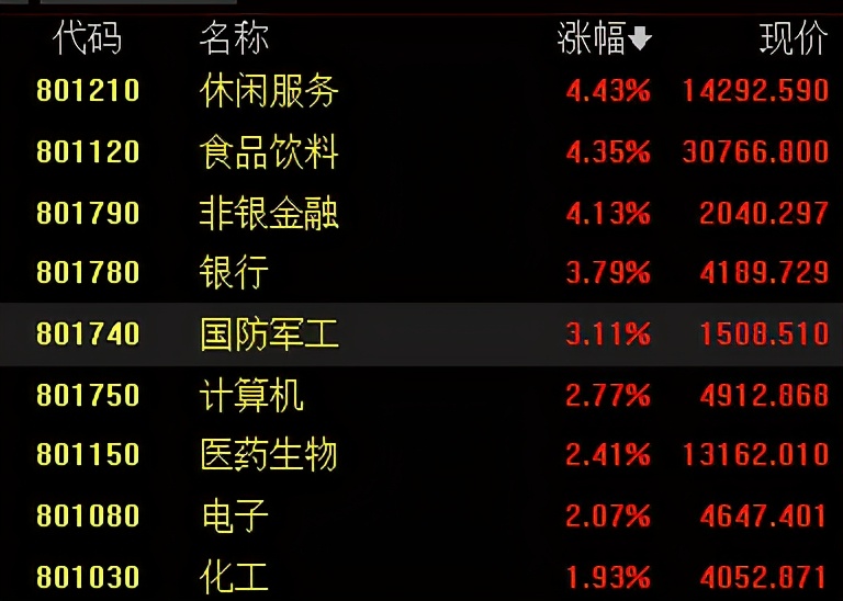 行业板块普涨,非银金融大涨逾4%,食品饮料、休闲服务、银行、国防军工等板块指数均涨逾3%。概念方面,奢侈品、无线耳机、医美、消费电子等板块均涨逾3%。一批行业龙头飙涨,非银金融的中信建投(33.960, 3.09,10.01%)、中金公司(59.710, 5.43, 10.00%)等多只个股涨停;食品饮料行业的茅五泸均涨逾5%;国防军工的航发动力(46.590, 4.24, 10.01%)涨停。
