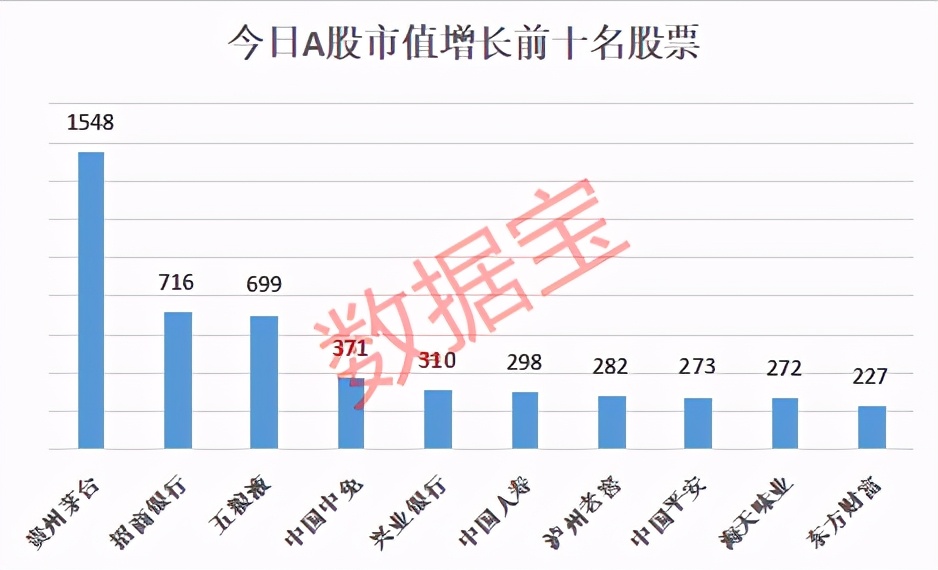 权重板块集体发力,A股各指数全线大涨,收盘涨幅均超2%。从市值角度看,沪深两市A股最新市值超过83万亿元,相比昨日暴涨1.8万亿元。其中,贵州茅台(2194.500, 123.21, 5.95%)市值增长1548亿元居首,招商银行(57.550, 3.47, 6.42%)、五粮液(323.030, 18.02, 5.91%)、中国中免(339.280, 18.99, 5.93%)、兴业银行(23.140, 1.49, 6.88%)等个股均A股市值均增超百亿元。核心资产成为市值增长主力军,140多只概念股市值增长逾万亿元。