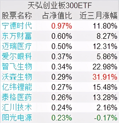 公告书显示,截至2021年5月18日,创300ETF前十大重仓股中,宁德时代占净值比最高,近1%;从近三个月涨跌幅看,前十大重仓股除阳光电源下跌0.17%外,其余个股集体上涨,其中沃森生物、智飞生物和亿纬锂能分别涨31.91%、22.98%和15.48%。