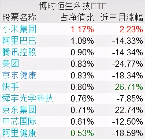 公告书显示,截至2021年5月18日,博时恒生科技ETF前十大重仓股中,小米集团和阿里巴巴占净值比最高,均超1%;从近三个月涨跌幅看,前十大重仓股除小米集团上涨2.23%外,其余个股集体下跌,其中快手、美团和京东集团分别跌26.71%、24.77%和22.74%。