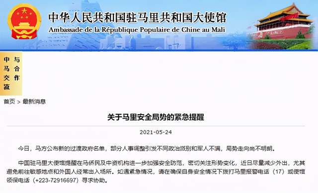 5月24日,中国驻马里大使馆发布紧急提醒,马方公布新的过渡政府名单,部分人事调整引发不同政治派别和军人不满,局势走向尚不明朗。