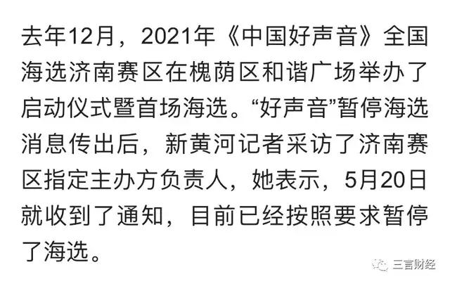 此外,新黄河客户端的记者对济南赛区进行了咨询,济南赛区表示,5月20日接到了通知,目前已经按照要求暂停了海选。