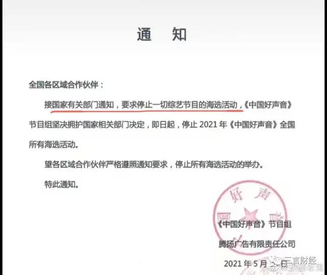 5月24日,一张疑似《中国好声音》节目组在20日发出的通知传出,通知中写道:“接国家有关部门通知,要求停止一切综艺节目的海选活动”。
