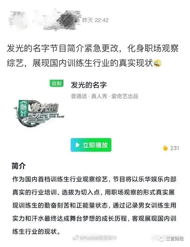 还有网友表示,《发光的名字》紧急更改了节目简介,成了职场观察综艺。