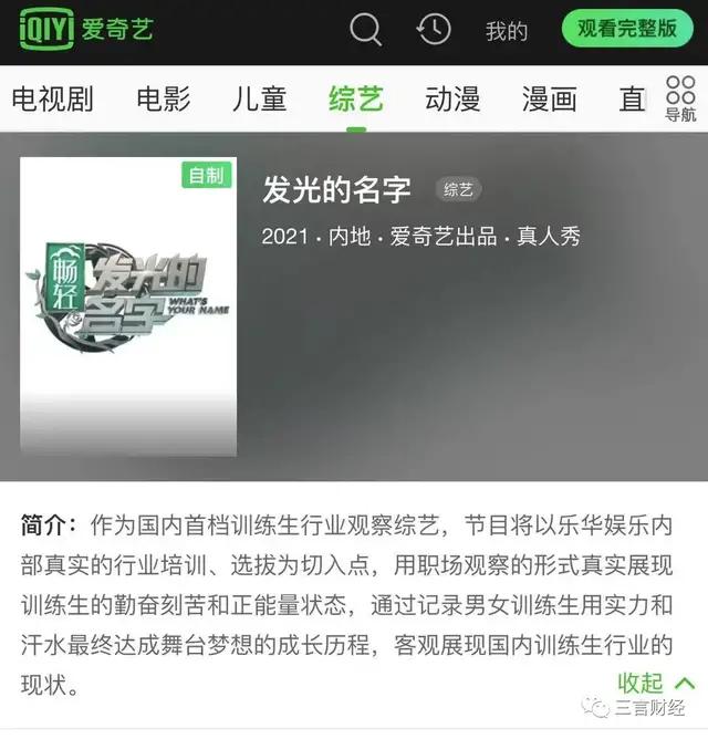 首先,三言财经发现,爱奇艺上《发光的名字》简介确实是:训练生行业观察综艺,节目将以乐华娱乐内部真实的行业培训、选拔为切入点,用职场观察的形式真实展现训练生的勤奋刻苦和正能量状态。