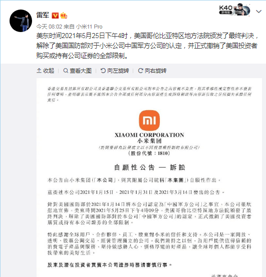 小米董事长兼CEO雷军本人也在微博贴出该公告,并留言表示“我们赢了”,激动之情溢于言表。