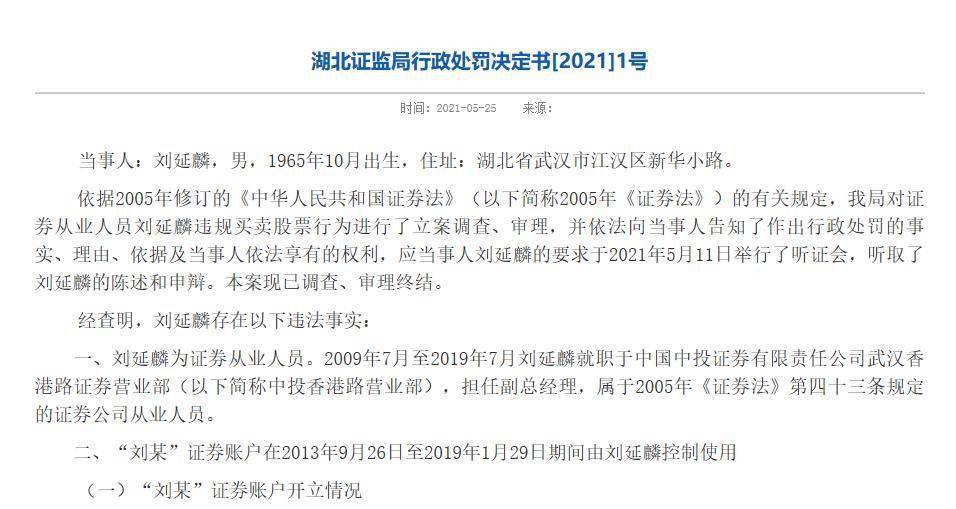 5月25日,湖北证监局对中国中投证券刘延麟违规买卖股票行为进行了立案调查、审理,最终决定没收其违法所得97万余元,并处以97万余元罚款。