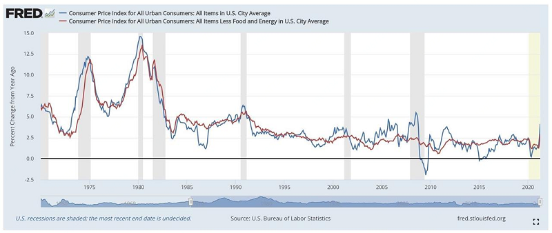 为了说明我们的意思,让我们把1974年12月(通胀率11- 12%)和1980年5月(通胀率13-14%)的峰值与如今(2021年4月的数据)进行比较: