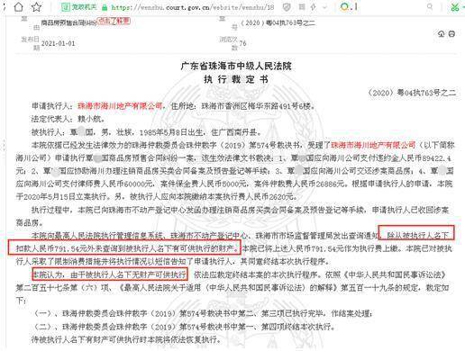 需要注意的是,中国裁判文书网2021年1月发布的《珠海市海川地产有限公司、覃某国国内非涉外仲裁裁决执行实施类执行裁定书》显示,法院在执行过程中发现除了执行几百元可执行财产外,并未查询到其他可供执行的财产。