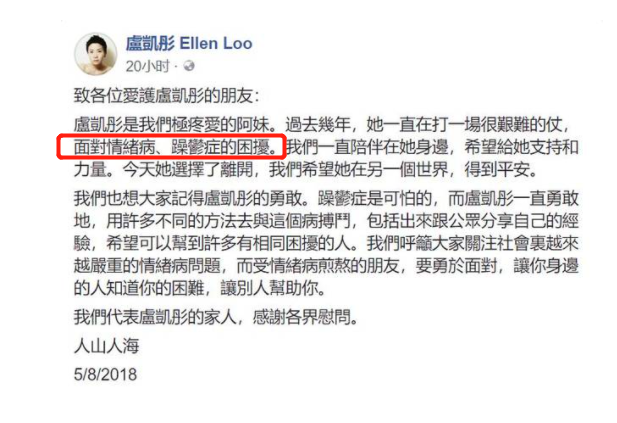事发之后,卢凯彤的家人通过她的社交账号发文表示,在过去的几年里,卢凯彤一直饱受情绪病、抑郁症的困扰,家人们一直陪伴在她的身边。