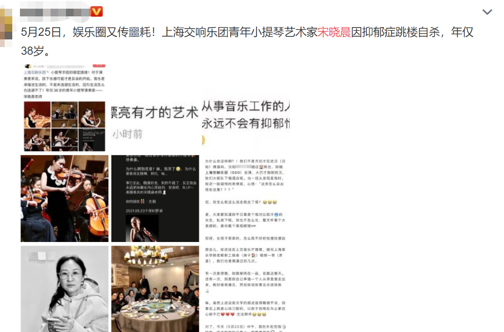 5月25日,某交响乐团青年小提琴艺术家宋晓晨因抑郁症跳楼轻生,年仅38岁。这样一位漂亮且有才华的艺术家年纪轻轻便选择结束生命,令人唏嘘不已。