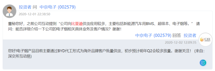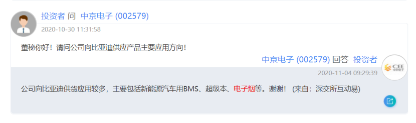 中京电子在互动易上回复称,公司向比亚迪供货应用较多,主要包括新能源汽车用BMS、超级本、电子烟等。