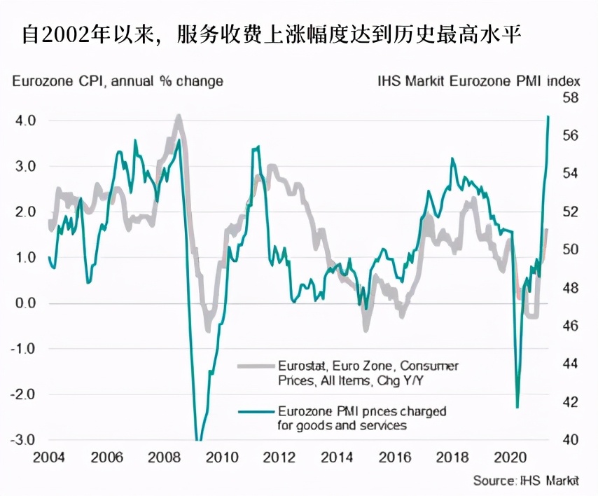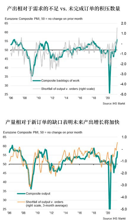 IHS Markit的PMI预览数据显示,随着欧元区继续解除疫情相关限制和重新开放经济,商品和服务需求正以近15年来的最快速度飙升,需求达到了23年来最大。尽管这预示着经济复苏将在未来几个月获得动力,但同时这种供需失衡也推动着价格以至少2002年以来前所未有的速度上涨。