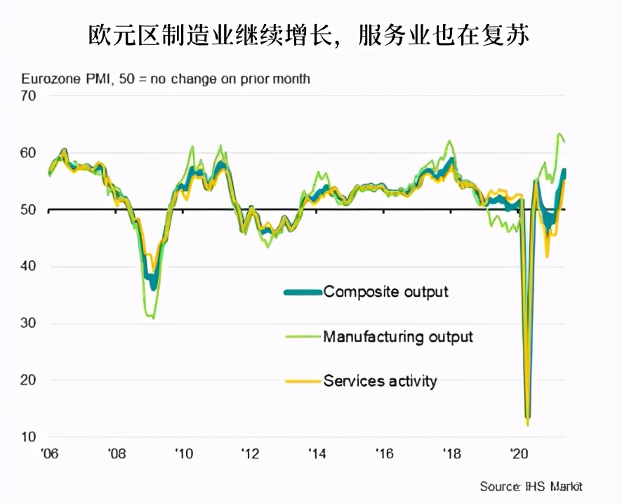 IHS Markit的欧元区PMI值从4月份的53.8升至5月份的56.9,而新订单指数的增幅甚至更大,达到58.4,是2006年以来的最高水平。